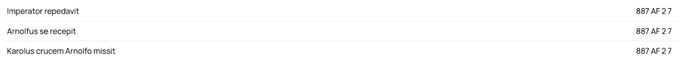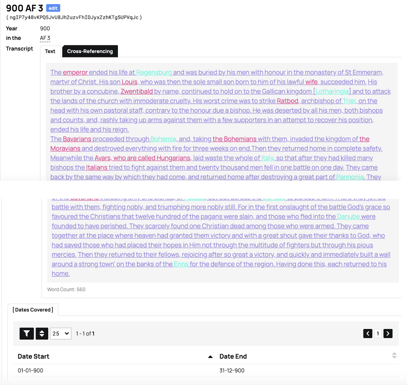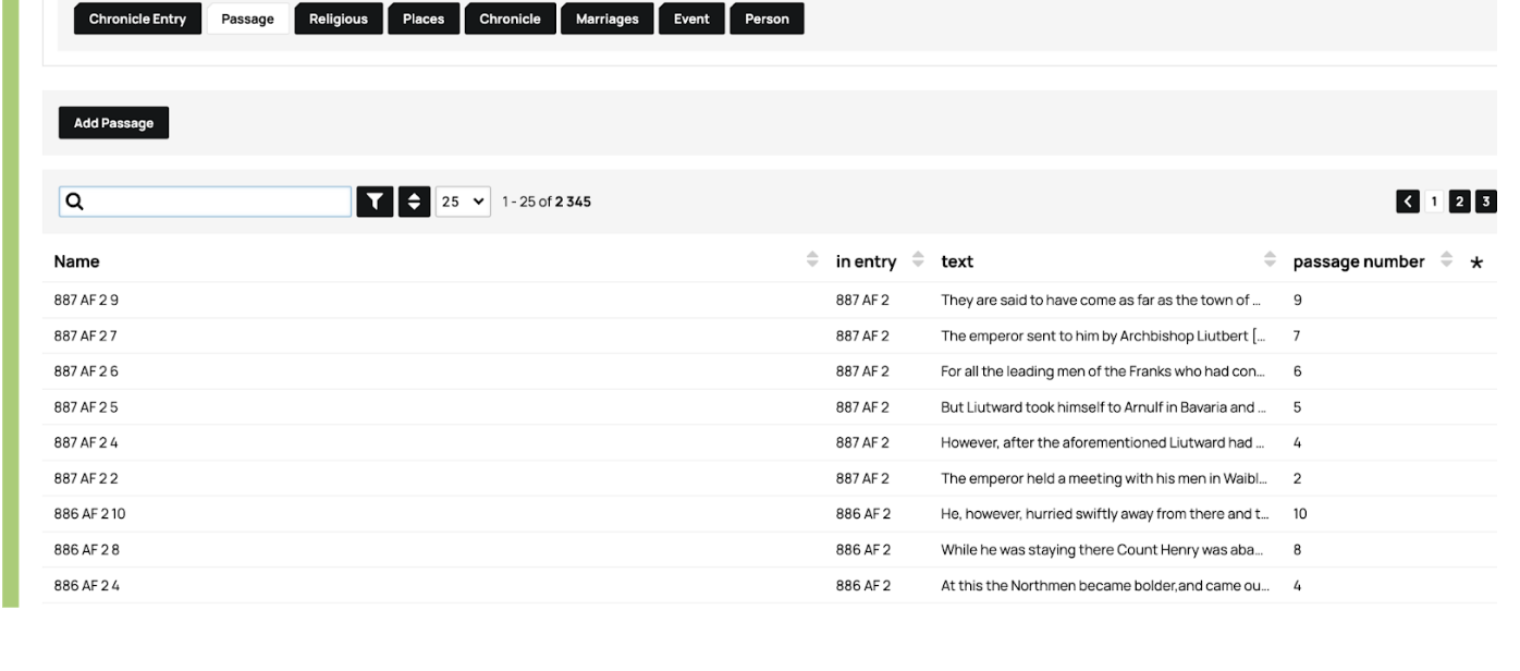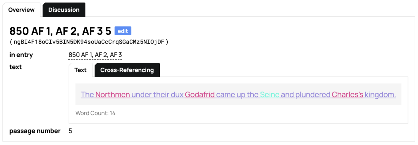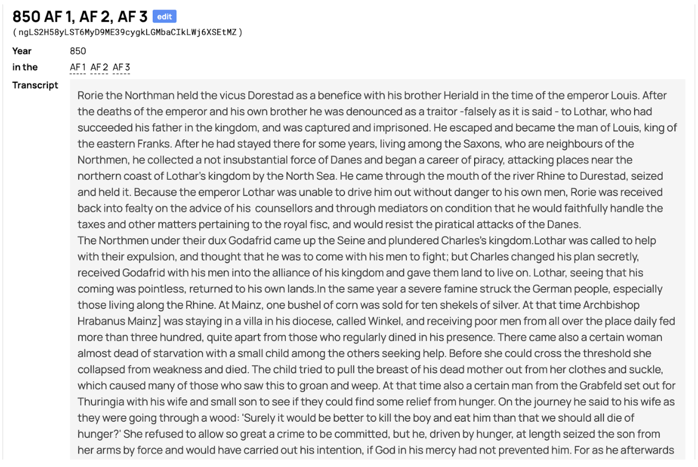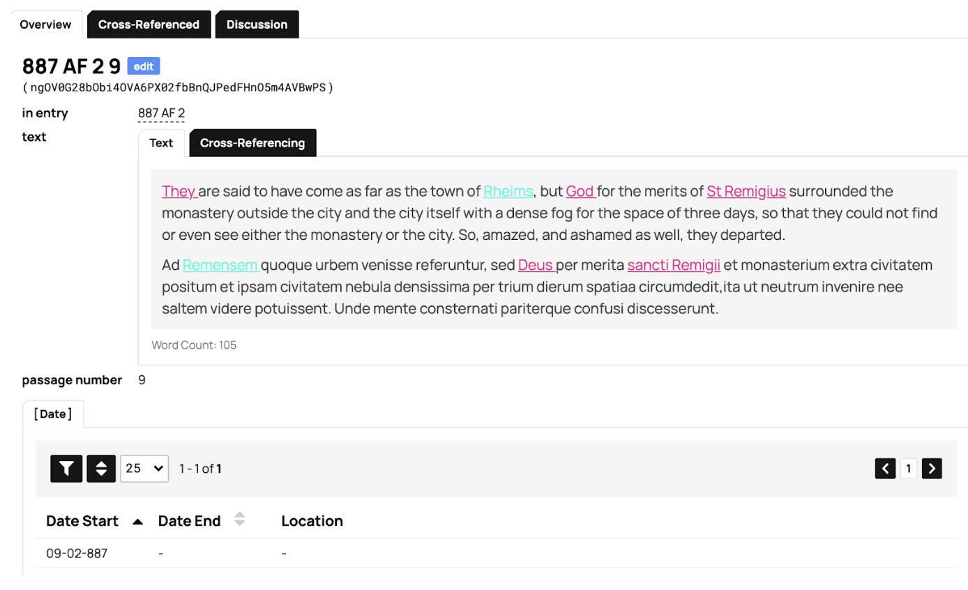 Persons and Places are tagged within the passage. However, there is an ongoing discussion as to whether to tag the Latin or the English version, or both. We won’t be tagging the event within the passage now. The “Date Start” is actually not a chronological thing. The ‘year’ is the chronicle entry year, the ‘month’ is the version of the annual [i.e. AF1 = 01, AF2 = 02], and the ‘day’ is the numbering of the passage [Passage 8 = 08]. Something to note in the titling of the passages should be [0X] for any number that is less than 10 due to a coding/decimal issue that messes up the order.
