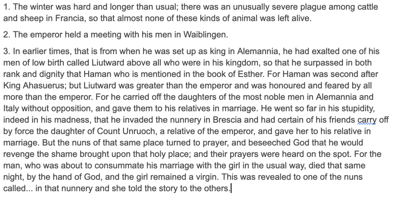 The tagger is instructed to read through the chronicle entry and manually split up the chronicle into passages (preferably on a separate document website) like so: