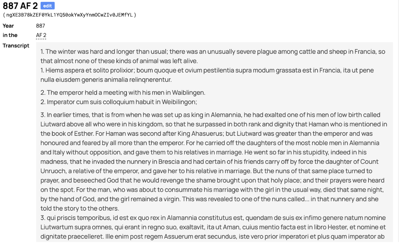 Once this is done, the Latin taggers can add the Latin version and re-input the entire text file back into the chronicle entry, like so: